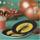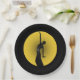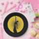 Set of eight 9” black paper plates with an image of an Art Deco female silhouetted in the bright yellow light of a full moon.
