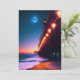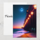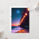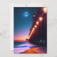 Beautiful greeting card for beach lovers features a pier with lit lampposts and a glowing full moon at dusk. Design created using AI software. Customisable "thinking of you" text