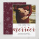 cute & simple birth announcement card during the winter or holidays season with personalised photo, the back features silver glitter snowflakes and burgundy/dark red background
