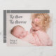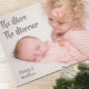 The more the merrier new baby announcement for the holiday season with traditional grey script text. Photo template via Pixabay licensed under CC0 and must be replaced with your own photo