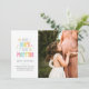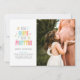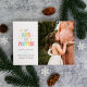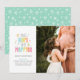 Share your joy over the upcoming arrival of the newest member of your family this holiday season with this photo pregnancy announcement. It features the words "the more the merrier" in colourful letters surrounded by snowflakes on the left with space for a photo on the right.