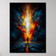 A powerful expressionist artwork featuring a lone figure confronting an immense eruption of fire and light. Rich textures, dramatic scale, and symbolic intensity create a dark emotional composition about reckoning, awe, and the trial of the self.