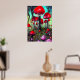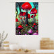 A large mushroom forest where you can find large red and purple mushroom, blue sky and trees in the background. This is a AI generated art