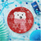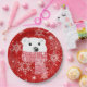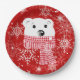 Polar bear muzzle in a red plaid scarf on a red background with white snowflakes.