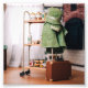 Jacket hanging on a rolling cart near a suitcase set on the ground.