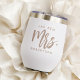 Show off your new last name with our super cute personalised stemless wine glass! Design features "the new mrs. [lastname]" in neutral taupe handwritten script typography. Easily customise using the template field provided. Makes a great gift for a newlywed or recent bride.