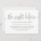 Set the tone for a memorable evening with our Customisable Rehearsal Dinner Invitation, featuring the elegant phrase "The Night Before" in whimsical script. This elegant rehearsal dinner invitation is designed to capture the excitement of the night before the big day. Whether you're hosting a small, intimate gathering or a larger celebration, this wedding rehearsal invitation is the perfect way to invite your closest friends and family to share in the magic. Personalise the invitation with your event details, including the date, time, and location.