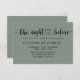 Set the tone for your celebration with this modern and sophisticated rehearsal dinner invitation. Featuring sleek black calligraphy stating ‘the night before’ alongside a charming heart detail on a soft sage green background, this design strikes the perfect balance between simplicity and romance. Easily customise it with your own details to make it truly your own.