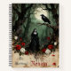A woman in black gazes at a raven perched on a tree branch in a mysterious forest under a full moon. Red and white roses form a border near the bottom. Beautiful, gothic, vintage fairy tale image.
