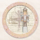 Beautiful coaster has music notes in the background and a nutcracker from the Nutcracker Suite, who is dressed in pale pink sequins and sparkles with a snowflake on his staff.  It has a creamy pink border and snowflakes all around.