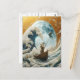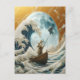 An old man in a small boat fishes in a giant wave with a large moon in the background. He is dressed in white robes and is holding a fishing rod. The wave is crashing around him, but he seems unfazed.