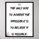 Embark on a journey of boundless possibilities with our captivating "The only way to achieve the impossible is to believe it is possible." Motivational Quote Poster. This stunning artwork serves as a beacon of hope and empowerment, reminding you that belief is the key to unlocking extraordinary achievements. With its striking design and uplifting typography, this poster radiates positivity and inspires you to embrace the power of faith and determination. Hang it prominently in your space, whether it's your office, study, or any room where you seek motivation, and let its message fuel your pursuit of greatness. Let this poster be a constant reminder that no dream is too grand, as long as you have the courage to believe in its realisation.