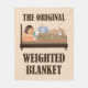 Weighted blankets may be used to comfort and reduce anxiety, both of which may improve sleep quality. Recently, weighted blankets have become widely available to consumers. But cat owners have been experiencing the stress-reducing benefits of sleeping under weight for years. Cats have the added benefit of providing white noise and light vibration through purring, plus body warmth, and love. This fun graphic cartoon design depicts a person sleeping in a bed, while two cats snooze on top. The cute image of kitty love is captioned with bold text that reads THE ORIGINAL WEIGHTED BLANKET.