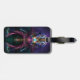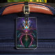 The alien portrait has piercing blue eyes, with a metallic gold brow structure, an ornamental violet blue head structure and deep rose facial flaring on either side of its face.
