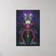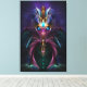 The alien portrait has piercing blue eyes, with a metallic gold brow structure, an ornamental violet blue head structure and deep rose facial flaring on either side of its face.