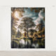 This tapestry shows a scene of a swamp with trees and the sun. It's an outdoors type of scene.
