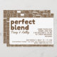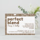 A wedding shower for the coffee lovers who are "the perfect blend." Espresso brown and white invitation with a fun background of coffee cups and pots, clean font, and artistic layout. Invite guests to pour out some love for the happy couple! Print this cool invitation or digitally download it and get the coffee brewing! Great for couple's shower of bridal showers.