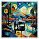 A.I .created print of vibrant scene features a person playing a piano against a mesmerizing, starry night sky above a colorful cubist, surreal landscape includes rolling hills, trees, and a lake reflecting the sky's luminous celestial bodies