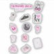 A collection of various stickers, each cut out and laid out against a white background. Starting from the top left, there's a silver disco ball, followed by a pink ribbon tied in a bow. Next to it is a white six-sided die with red dots. To the right of the die is a white sneaker with black stripes. Below the sneaker, there's