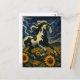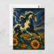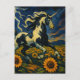 A pinto unicorn galloping through a sunflower field in a thunderstorm.