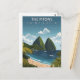 Escape to paradise with this stunning The Pitons Saint Lucia travel postcard! This captivating illustrated design features the iconic twin volcanic peaks, Gros Piton and Petit Piton, majestically rising from the crystal-clear Caribbean Sea. The scene captures the serene beauty of Saint Lucia's famous beaches, lush tropical foliage, and charming coastal villages