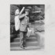 Black and white vintage photo of a mail carrier in uniform, on the steps of the Post Office. Bags of mail can be seen in the background. Photo c. 1914 by Harris & Ewing