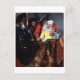 The Procuress by Johannes Vermeer, oil on canvas 1656, is one of the painter’s earliest known works, depicting a woman in a white bonnet and group of gentlemen in traditional Dutch costume. The richly coloured interior, costumes and tablecloth form a coloristic symphony of contrasting warm yellows, vermillion reds and ultramarine blues, foreshadowing the jewel-like colours and painstaking treatment of colour and form in the Vermeer’s more mature pictures. On the foreground table sits a white ceramic jug with glazed blue decor known as Delftware, which was made exclusively in Vermeer’s home city of Delft.