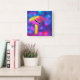 Neon coloured psychedelic Mushroom in pink and yellow against a bright blue and purple sparkling bokeh background