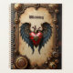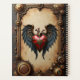 The pulsating heart of mechanics, a glowing steampunk heart. The frame features the characteristic steampunk style, chraacterised by a fascinating blend of Victorian elegance and industrial flair. Complex mechanical details such as intricate gears, screws, and bolts adorn the edge, lending depth and texture to the design. The heart is mechanically designed, with visible springs, small gears, and metallic embellishments that symbolise its vitality in a technical context. Flanking the heart are dark wings.