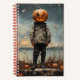 The image depicts a figure standing in an outdoor setting, wearing a worn-out, rugged military-style outfit with boots. Instead of a head, the figure has a large carved pumpkin with a menacing, glowing jack-o'-lantern face. The sky is overcast, giving the scene an eerie atmosphere, and the ground is scattered with dry vegetation and two small pumpkins, emphasizing the Halloween theme. The painting style is reminiscent of classic Americana, evoking a sense of both nostalgia and unease.