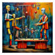 A.I .assisted print of a surreal, quirky puppet master with exaggerated features pulls the strings of his puppets making them walk and dance reading them for their performance on stage.