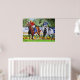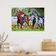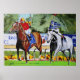 A colourful image of two race horses with jockeys in a horse race