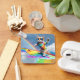 A high-quality, digitally rendered image featuring an anthropomorphic ginger and white cat in a full-body action pose. The cat is perfectly balanced atop a brilliantly coloured rainbow surfboard, its gaze coolly hidden behind reflective orange-lensed sunglasses. It sports a snug, short-sleeved rainbow-striped top. The entire scene is set against a simple, pale grey backdrop to emphasize the subject's striking colours and motion.