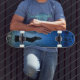 Dd brand skateboard, with graphic artwork of a black dressed reaper on a blue background, with a faint blue skull. Personalise the custom text to suit your needs.