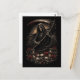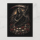 A hooded grim reaper with a bloodstained scythe rises over skulls and fading roses, marking the relentless passage of time and fate.