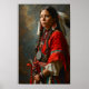 A young woman stands in traditional attire adorned with intricate beadwork and feathers. She gazes thoughtfully into the distance, holding an elegant bow.