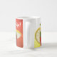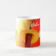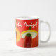 Still life of three red chilli peppers wearing sombrerors made of lemon and tangerin against the textured background of hot and sunny Mexican day. Coffee mug. Funny friendship theme. You can change the template text Hola, Amigo!