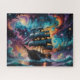 A majestic ship sails through the waves under a colourful sky of galaxies, stars and planets. Beautiful image for those who love fantasy, ships, and the sea.