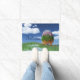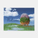 Four seasons appear on a lone tree standing in a grassy meadow. The top branches are bare and snow-covered, giving way to pink blossoms, which turn to dark green leaves, which turn orange and gold and fall to the ground. Amid the autumn leaves on the ground are blue spring flowers and melting snow.