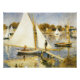Pierre-Auguste Renoir. The Seine at Argenteuil. Nice landscape in warm colours. There is a yacht with a white sail on the river bank. Ships are sailing along the river. Pale blue sky with clouds. Reproduction of famous works of art images in the public domain.