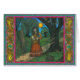 This colorful image shows a shaman beating her drum whilst around her fairy-folk and other creatures go about there normal lives, the central image is flanked by two rows of dragons and this is all held with in a repeating Celtic Tree of life