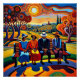A.I .created print of a group of siblings sitting on a park bench in an arrangement which subconsciously displays their relationships with each other as the sun sets in the distance over a surreal landscape representing the passage of time.