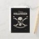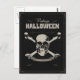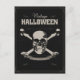 Simple postcard with a black background. In the centre of the skull with crossbones