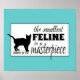 This cute design reads "The smallest feline is a masterpiece - Leonardo da Vinci" in a variety of fonts. It's accompanied by a silhouette of a cat. The design sometimes has white against a coloured background, or with a square panel behind the words. In both cases the background colour can be changed easily.