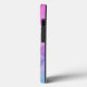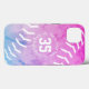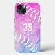This fun girl's softball iPhone case features a minimalist style softball (represented only by the ball's stitches in white) overlying a pink to blue distressed look gradient background - the text "The softball field is my happy place" encircles her custom jersey number - by katz_d_zynes