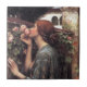 This design features a painting by the English Pre-Raphaelite artist John William Waterhouse (1849–1917). It shows an elegant young woman wearing a dark blue dress. She is standing in an Italian-style garden and holding a pink rose to her nose as he admires its beautiful scent and aroma. The lady has red hair that is neatly tied. Her eyes are closed and her mouth is slightly open, almost as though she is imagining a romantic kiss, as she smells the fragrant flower. The pink roses are growing against a wall that surrounds a fine villa: its architecture can be seen in the distance. The original artwork was painted by John William Waterhouse in 1908. The title is inspired by a poem writing by Alfred, Lord Tennyson in the 19th century.