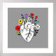 An elegant minimal illustration featuring an anatomical heart blooming with colorful flowers.