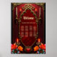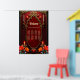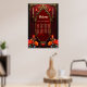 The spirit of the wonderful vintage style. Elegant gold-decorated vintage frame against a deep red background. A subtle texture reminiscent of rose petals is visible inside the frame. Tall, slender candles in gold candlesticks flank the frame, while additional smaller candles are placed higher up. Bright flowers in shades of red, orange, and teal add a mystical splash of colour.
