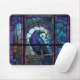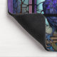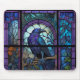 Depicted in stained glass, a spooky, creepy raven turns his gaze on the viewer.
