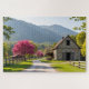 A dirt road goes between an old stone barn and blooming redbud trees, with hills in the distance, on this beautiful jigsaw puzzle of the Shenandoah Valley.
